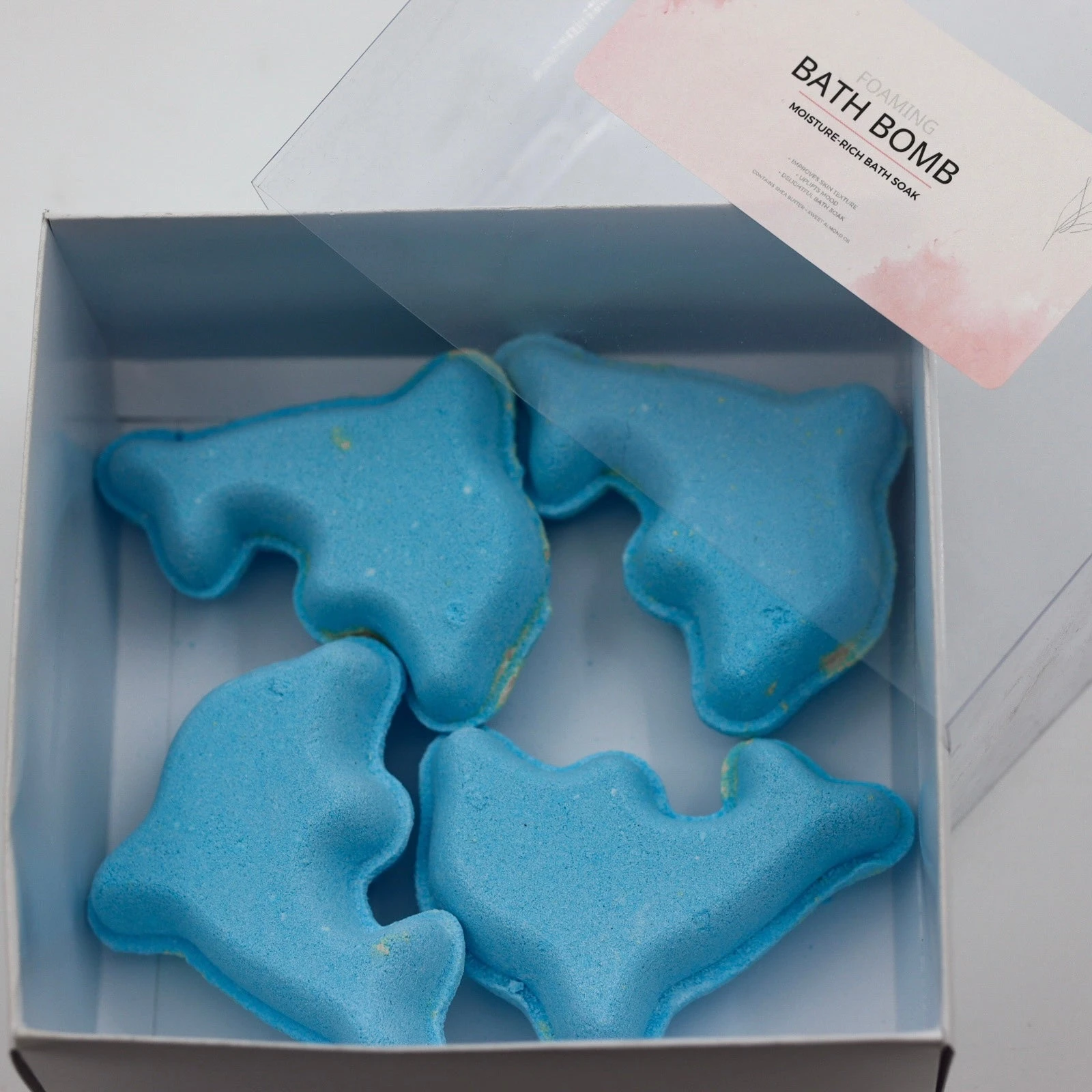 A Hamper of 4 Dolphin Shaped Bath Bombs. Calming, uplifting, and contains moisture-rich ingredients that nourish and soften skin. The burst of scents offers a delightful bathing experience.