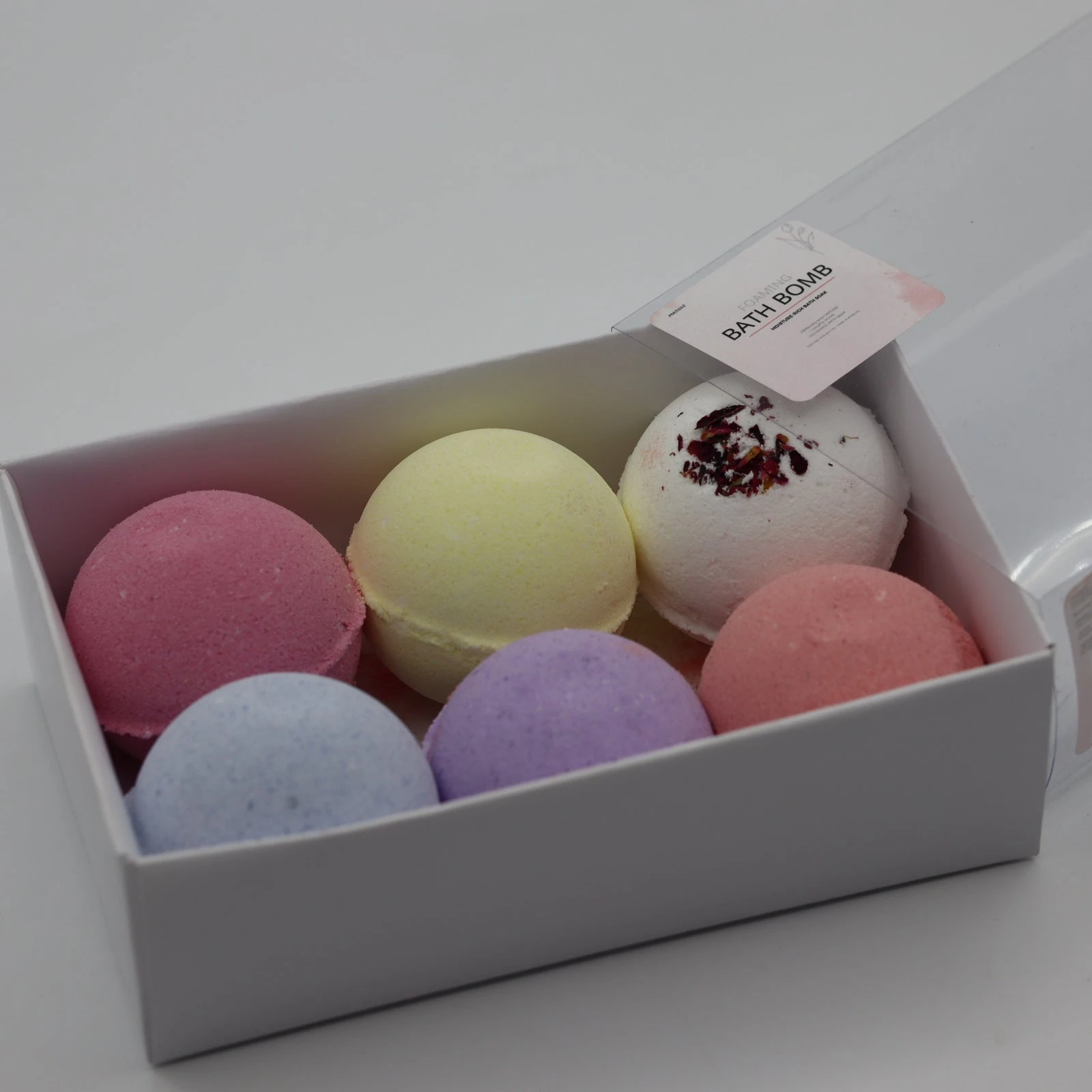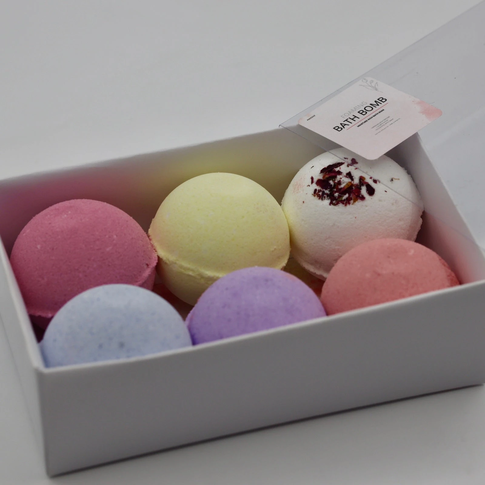 A set of 6 Assorted Standard sized Bath Bombs. Calming, uplifting, and contains moisture-rich ingredients that gently exfoliate, nourish and soften skin leaving it smooth and supple. The burst of scents offers a delightful bathing experience.