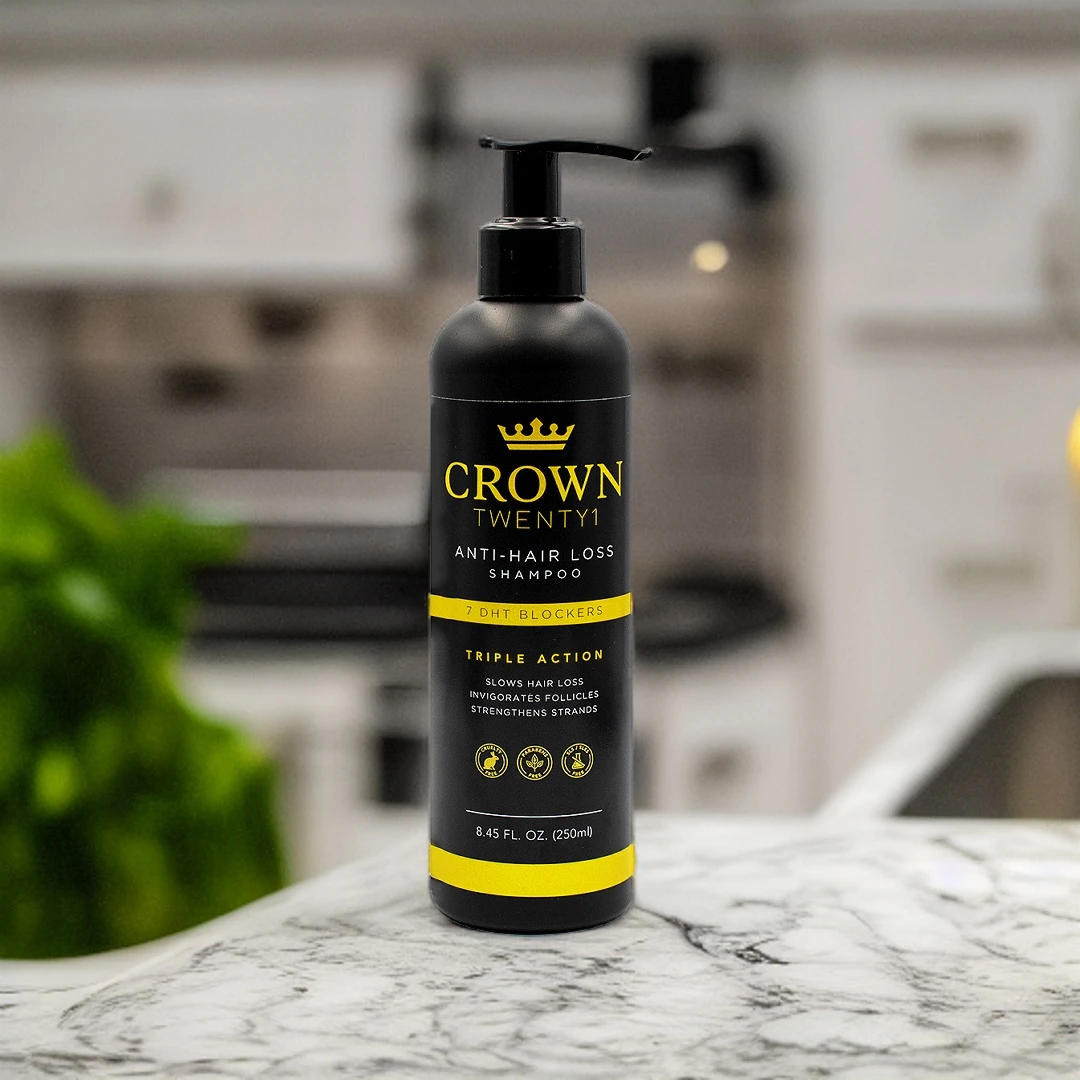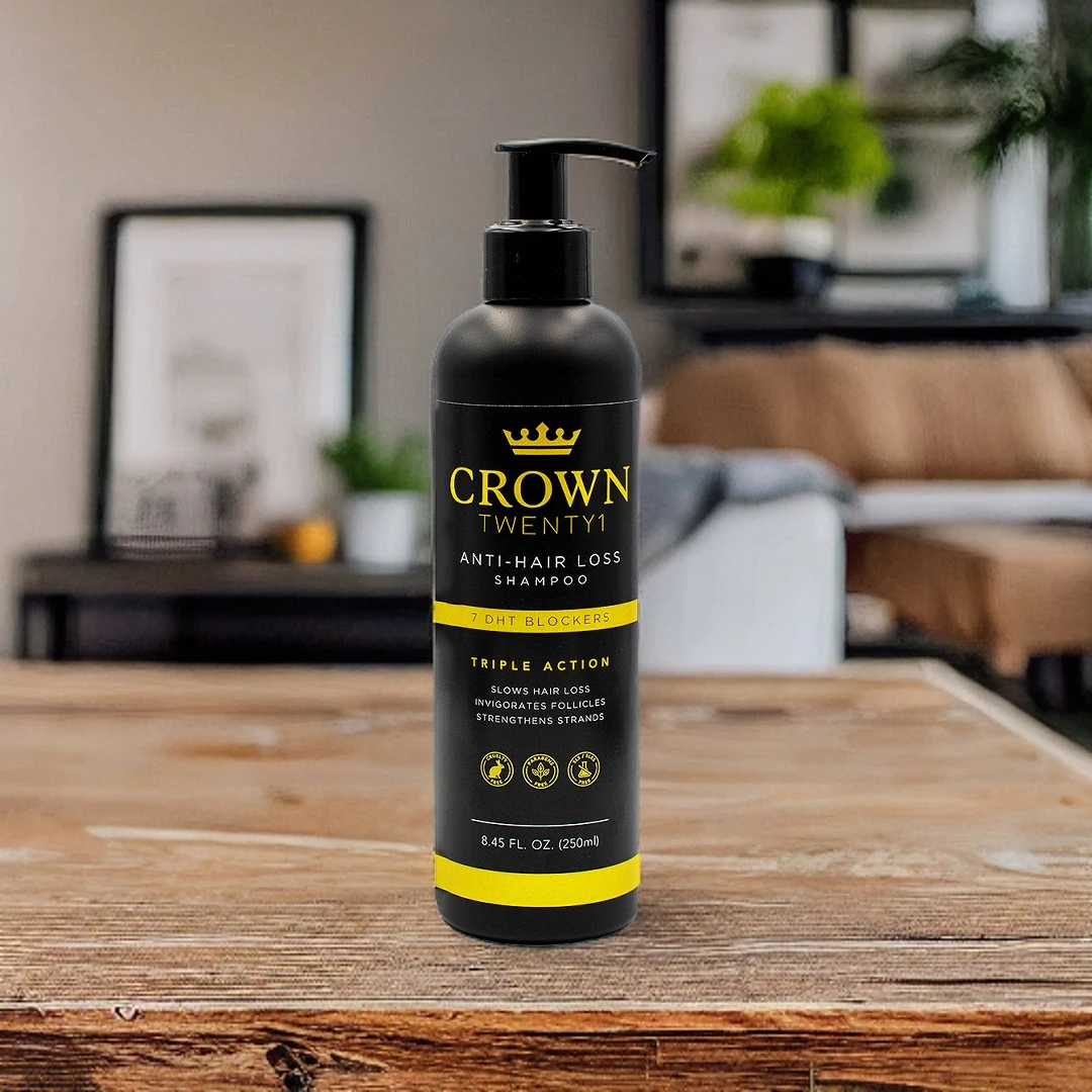 Crown Twenty1 Anti-Hair Loss Shampoo triple-action formula that targets thinning hair from root to tip using our unique fusion of 7 natural DHT blockers that slow down hair loss while invigorating follicles. This shampoo, will not just assist you in minimising hair loss or thinning hair, but will put the nutrients your hair requires to be strong, back into your hair.