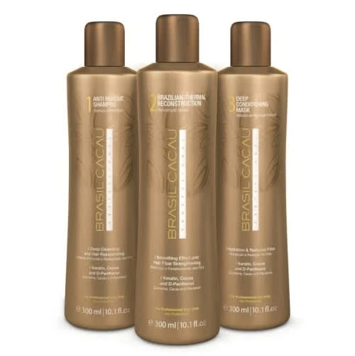 This thermal hair restructuring kit contains Brasil Cacau Anti-Residue Shampoo (300ml), Brazilian Thermal Reconstruction (300ml), Brasil Cacau Deep Conditioning Mask (300ml) and two pumps.